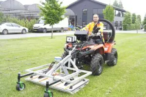 Onze grondradar hangen we onder een elektrische squad of handkar. Zo brengen we duurzaam de ondergrond in kaart. Voor ons eigen werk in de spoorse omgeving, bevestigen we hem ook aan de Leonardo inspectietrein.