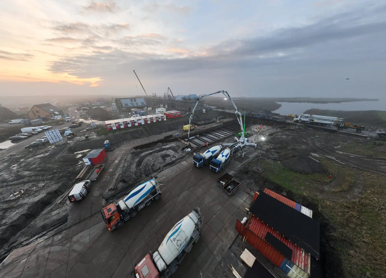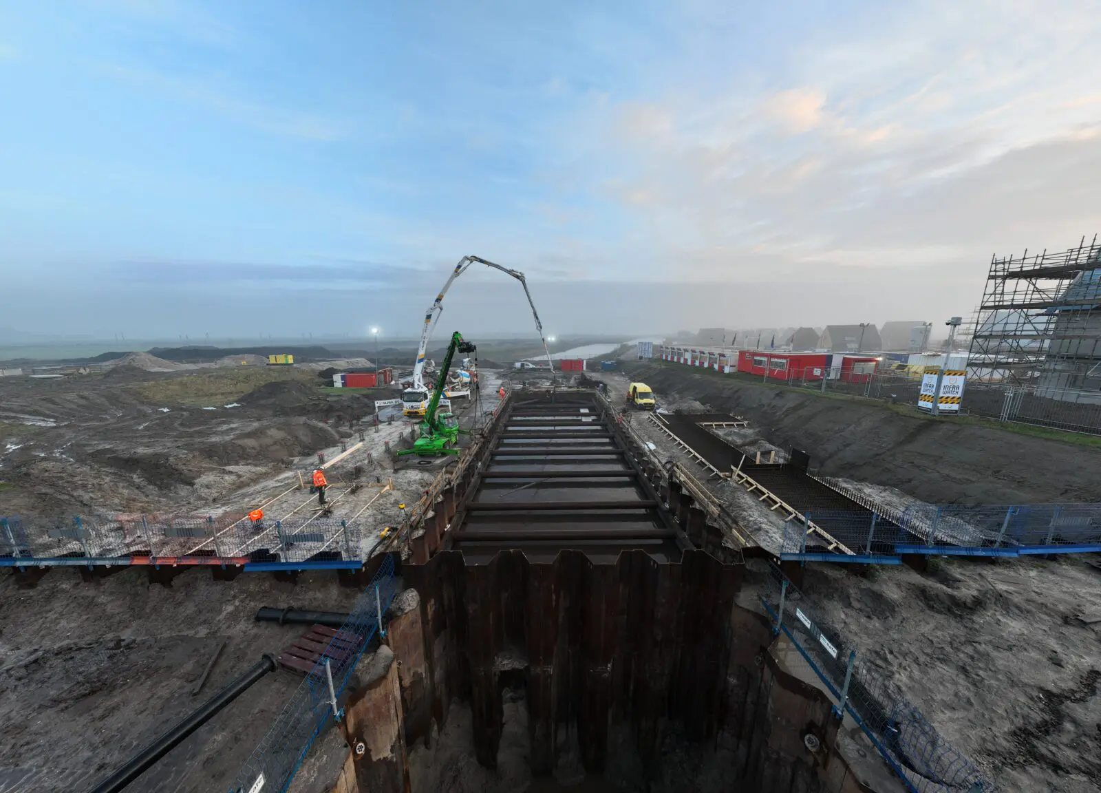 Het bouwteam bevindt zich inmiddels in de laatste fase en de realisatie is opgestart. “Onze bouwkeet staat er al en als je aan komt rijden staan er nu 20 huizen en een bord ‘Welkom in Reeve”, lacht Patrick. Na het aanbrengen van de damwanden voor de bouwkuip volgt in december het storten van het onderwaterbeton. Het betonwerk voor de sluis gaat in januari van start. Vóór het stormseizoen najaar 2024 moet de sluis gebouwd en getest zijn.