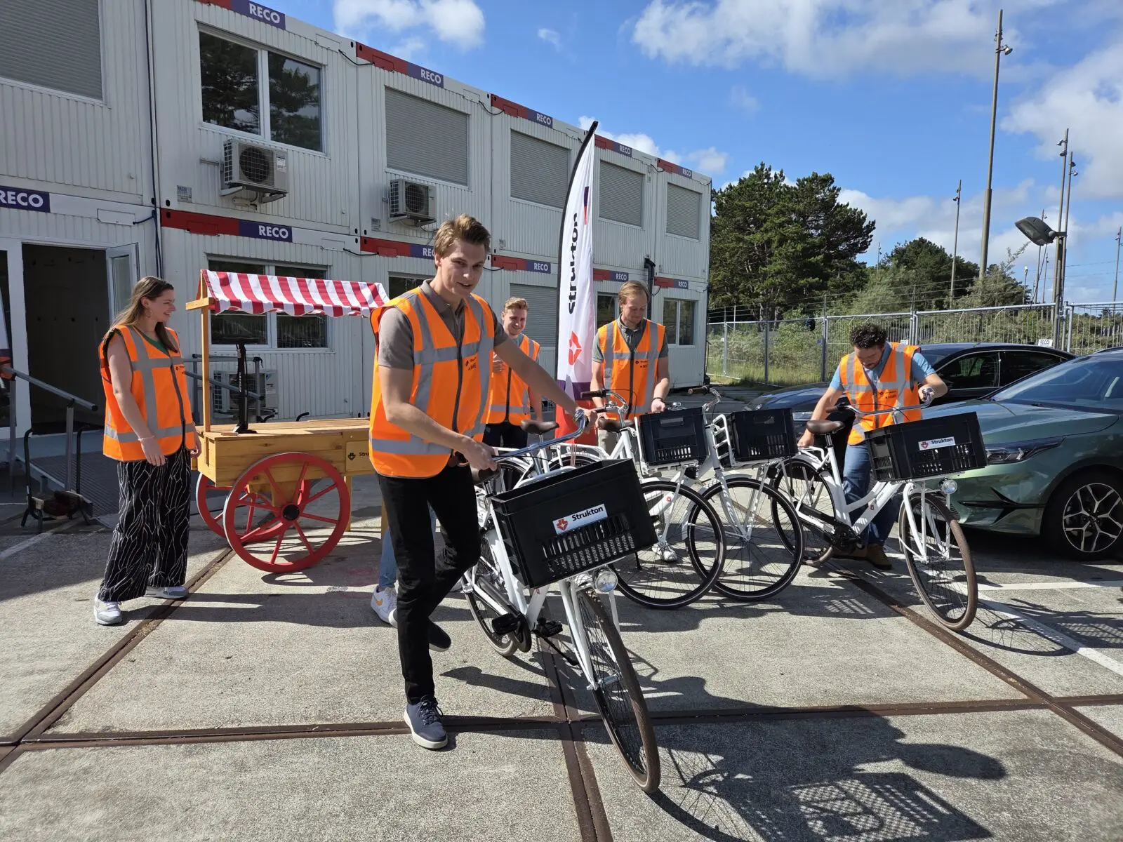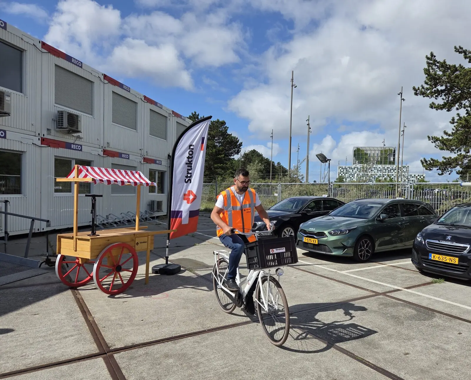 Elke fiets is uitgerust met een krat, stevig slot en krijgt een herkenbare witte kleur met duidelijke Strukton-logo’s. We gebruiken ze om gemakkelijk te reizen tussen de drie bouwlocaties en de keet. Daarbij kregen we ook een fietspomp en multitool voor het kleine onderhoud.